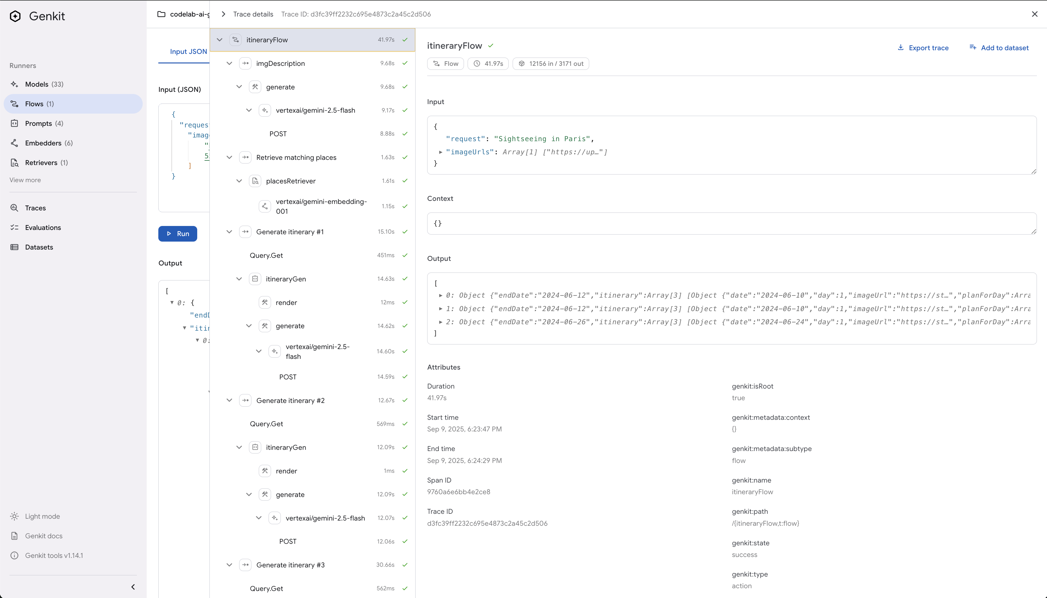 - W interfejsie deweloperskim Genkit wyświetl przepływ Genkit w pliku