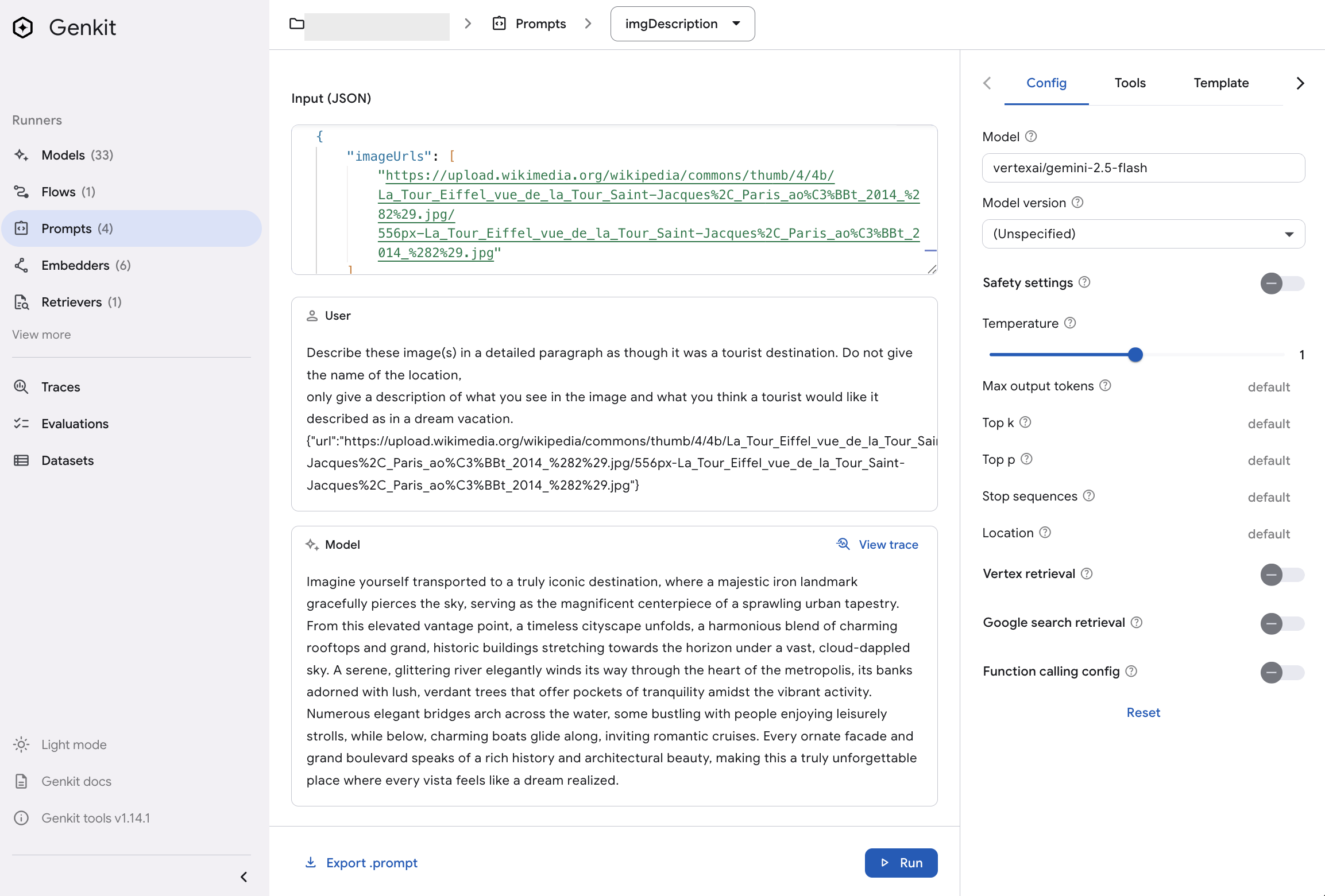 itineraryFlowwith your newly added step:{ "request": "Sightseeing in Paris", "imageUrls": [ "https://upload.wikimedia.org/wikipedia/commons/thumb/4/4b/La_Tour_Eiffel_vue_de_la_Tour_Saint-Jacques%2C_Paris_ao%C3%BBt_2014_%282%29.jpg/556px-La_Tour_Eiffel_vue_de_la_Tour_Saint-Jacques%2C_Paris_ao%C3%BBt_2014_%282%29.jpg" ] } - Click Run.