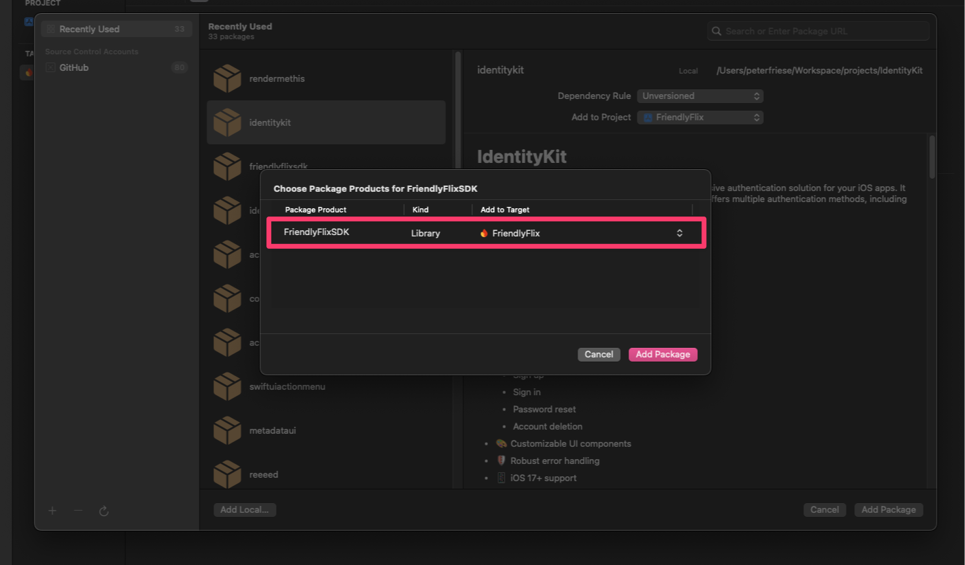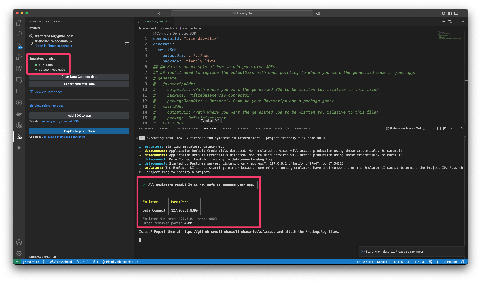 هنگامی که این فایل را ذخیره کردید، Firebase Data Connect یک بسته سوئیفت به نام FriendlyFlixSDK