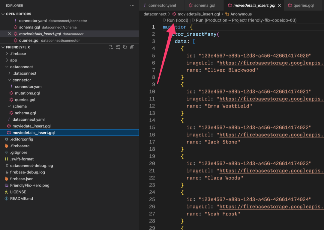 codelab-dataconnect-ios/FriendlyFlix 目录中运行以下命令: