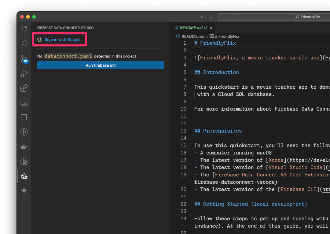 3. 在 VS Code 中,打开 codelab-dataconnect-ios/FriendlyFlix 目录。