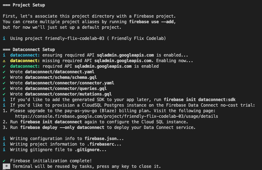 重要提示:如果您是首次在项目中部署架构,此过程将创建一个 Cloud SQL PostgreSQL 实例,这可能需要大约 15 分钟。在 Cloud SQL 实例准备就绪并与 Firebase Data Connect 集成之前,您将无法进行部署。