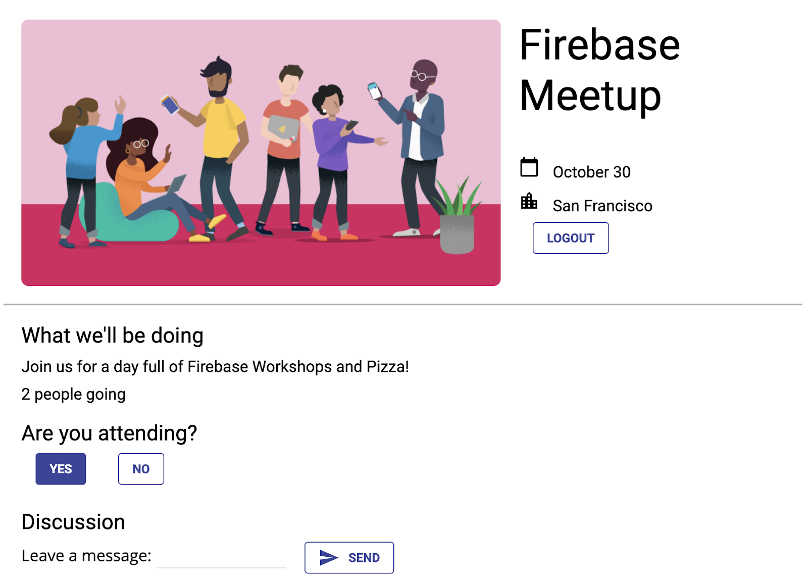 guestbook-container, হ্যাঁ এবং না বোতামগুলির একটি সেট যোগ করুন, যেমন:<!-- ... --> <section id="guestbook-container"> <h2>Are you attending?</h2> <button id="rsvp-yes">YES</button> <button id="rsvp-no">NO</button> <h2>Discussion</h2> <!-- ... --> </section> <!-- ... -->