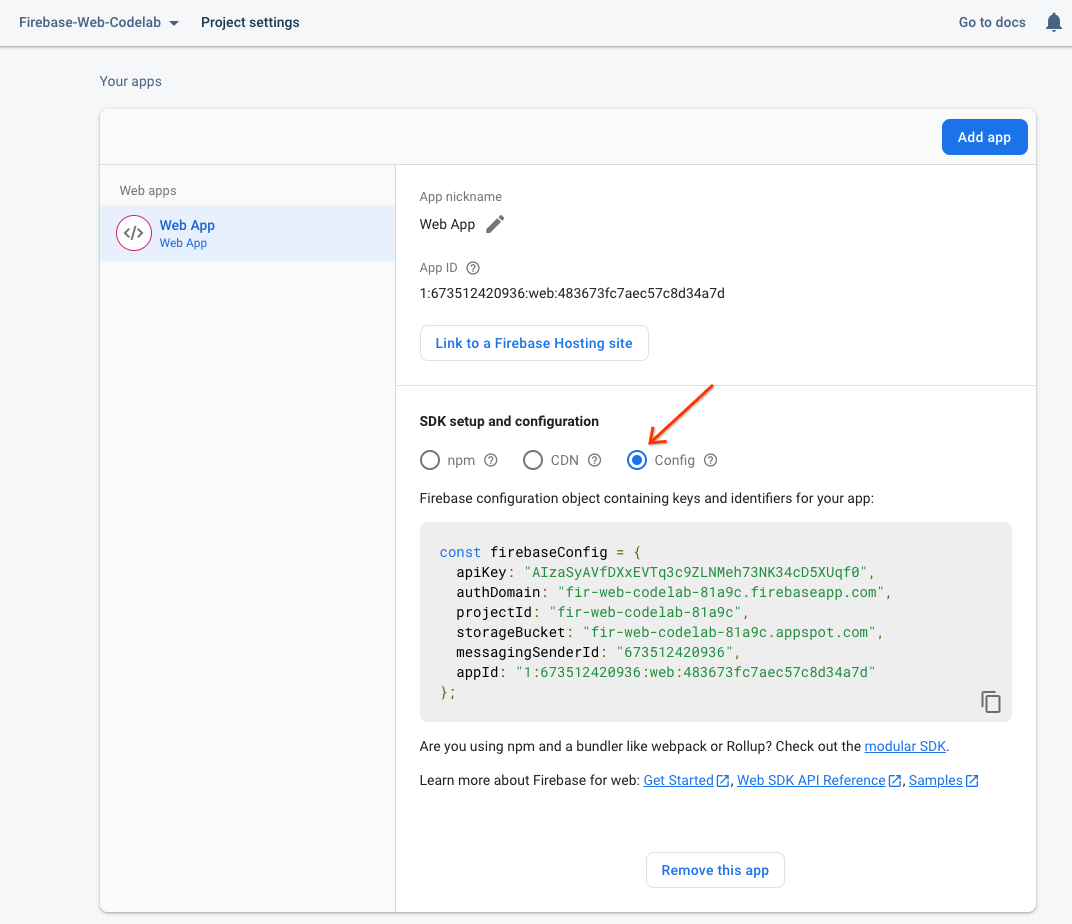 - Haz clic en Ir a la consola.Agrega el objeto de configuración de Firebase a tu app: