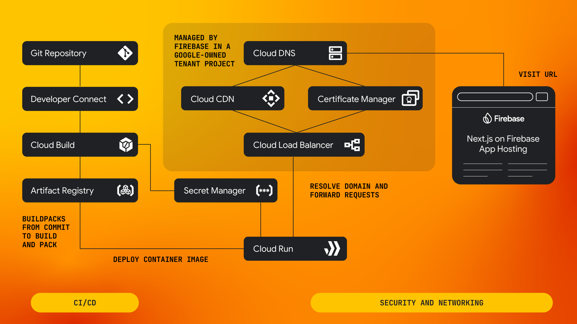 App Hosting מתזמרת קבוצה של מוצרי Google Cloud כדי שתוכלו לפרוס, להציג ולנטר את אפליקציית האינטרנט שלכם. האפליקציות נבנות באמצעות Cloud Build, מוצגות ב-Cloud Run ונשמרות במטמון ב-Cloud CDN. שירותים משולבים כמו Cloud Secret Manager שומרים על מפתחות ה-API שלכם.