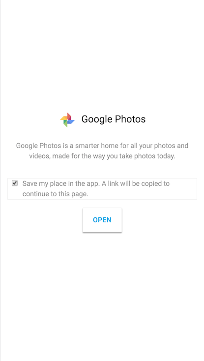 应用预览页面还能实现在 iOS 设备上将 Dynamic Links 作为唯一的匹配项进行接收。当用户选择 Save my place in the app(保存我在应用中的位置),并点击 Open(打开)后,Dynamic Link 会复制到 iOS 剪贴板;然后,当您的应用打开后,Dynamic Links SDK 会接收链接,并且可百分百确保应用当前的用户就是点击链接的用户。
